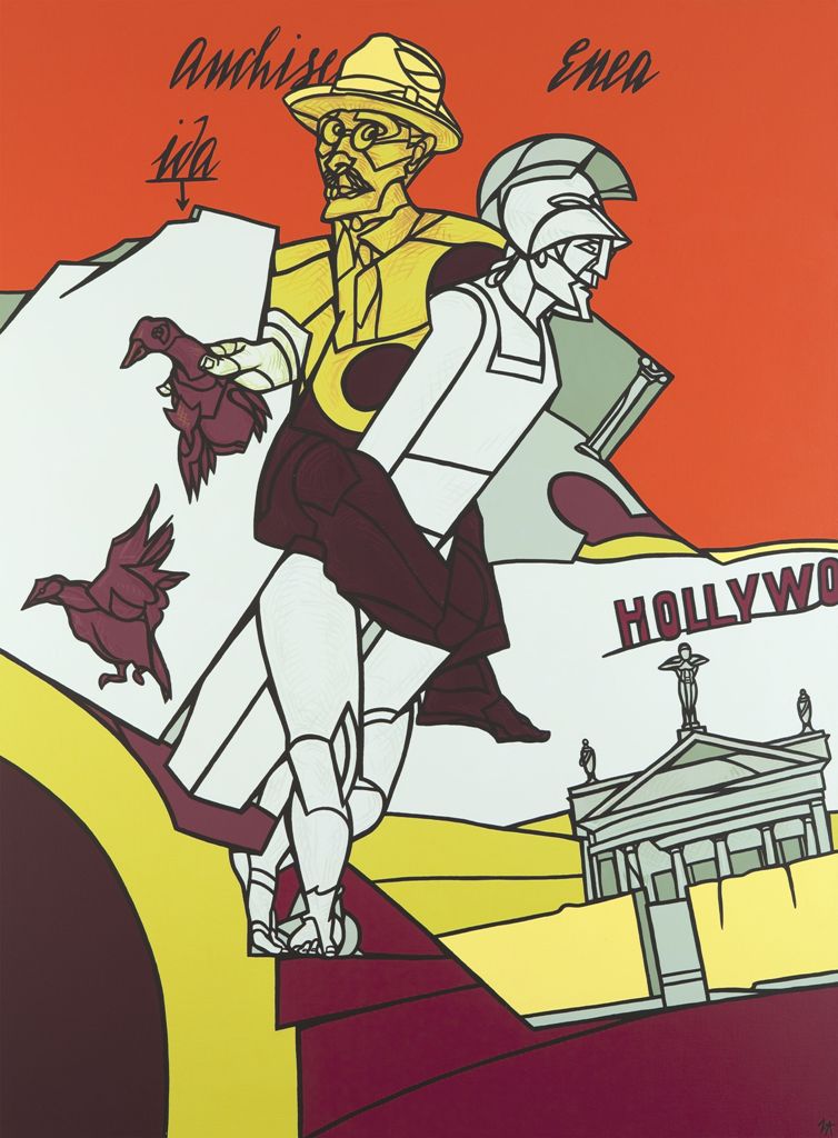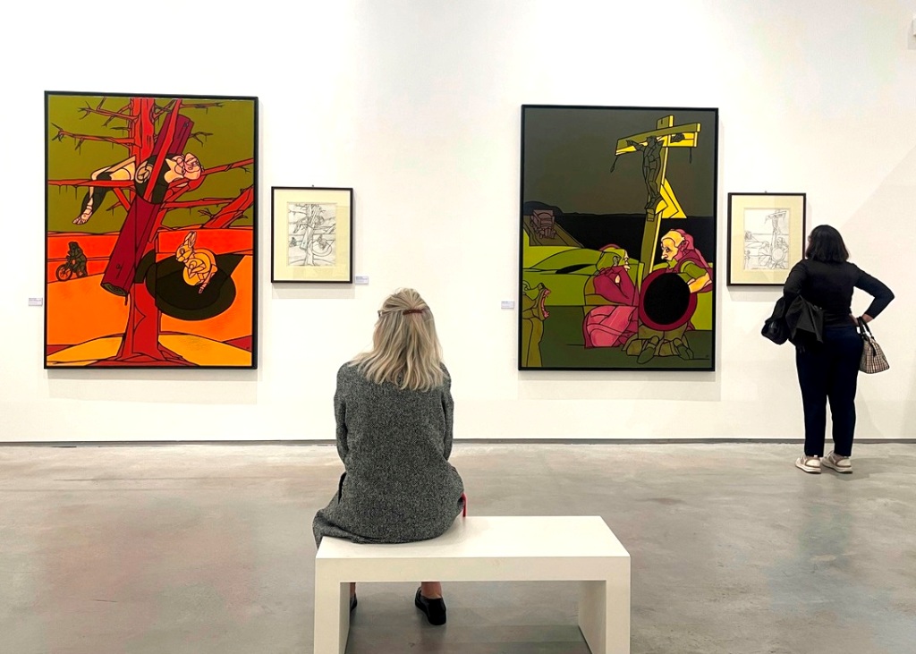 In mostra emergono i rimandi alla storia dell’arte – dalla Trasfigurazione di Raffaello al San Pietro di Crivelli – e le citazioni letterarie e poetiche, lavori emblematici come Calvario ispirato a W.B. Yeats o Figura crocifissa dedicato al pittore Ben Shahn che tanto aveva rappresentato la fine degli anarchici Sacco e Vanzetti. Compaiono angeli – figure nate in occasione della scomparsa del padre e poi sempre più presenti come simboli universali – e sfingi, Caronte e le divinità del mondo classico, ma anche icone dell’ebraismo e dell’Islam come il muro del pianto, le menorah e le moschee.