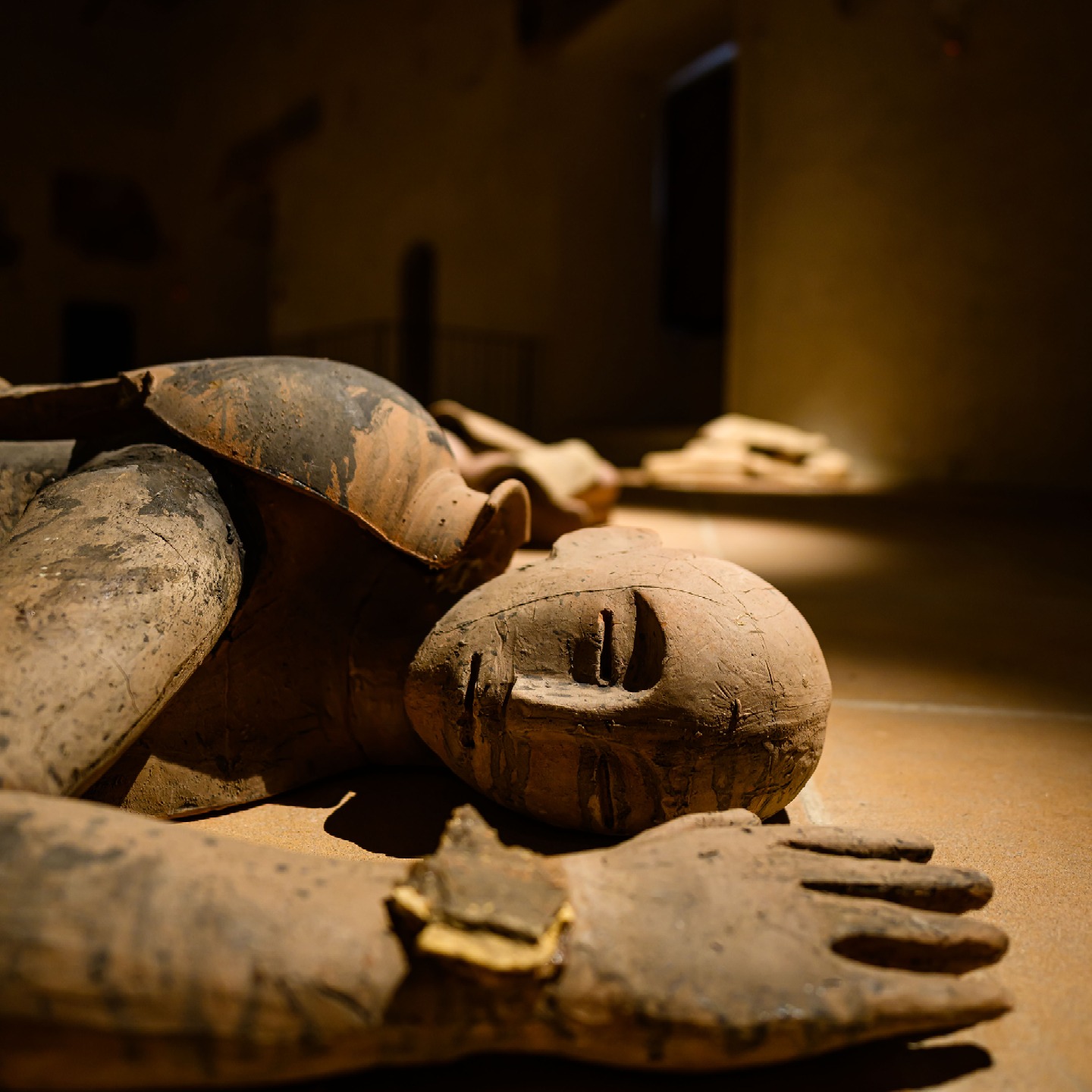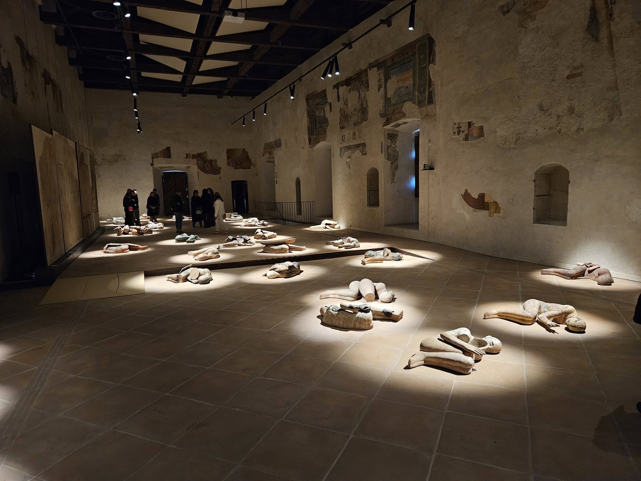 Nell’esposizione a Spoleto domina il tema della scultura. Il Salone d’Onore ospita la commovente installazione Senza titolo (2006), dove il tema delle geometrie appare filtrato da una più forte istanza antropologica ed esistenziale. Gli elementi in alluminio sono i resti derivati dalle sculture lignee utilizzate durante le riprese del film Quijote; una volta bruciati per esigenze di copione, i frammenti sono stati poi fusi e ricollocati in questo nuovo sistema ritmico, altrettanto onirico e drammaturgico. Nel Salone Antonini, invece, i Dormienti occupano silenziosi tutto lo spazio a loro disposizione, indifferenti ai lacerti di affresco del Maestro delle Palazze e alla grande scritta che campeggia la parete, “Finisce tutto. Finisce”. La prima ideazione del gruppo scultoreo è alla Fonte delle Fate di Poggibonsi, nel 1988, i cui pezzi sono stati successivamente trasformati in bronzo e resi permanenti. Nel 1999, l’installazione conquista i sotterranei della Roundhouse di Londra, uno spazio reso fascinoso dalla sua stessa storia e dall’architettura circolare, con tunnel in mattoni rossi che si dispongono a raggiera. Come “sculture di suoni”, le note di Brian Eno accompagnano la visione delle figure in terracotta, ciascuna chiusa nel proprio sonno. Si ricrea lo stesso accoppiamento suono-immagine, in una dimensione immersiva e avvolgente