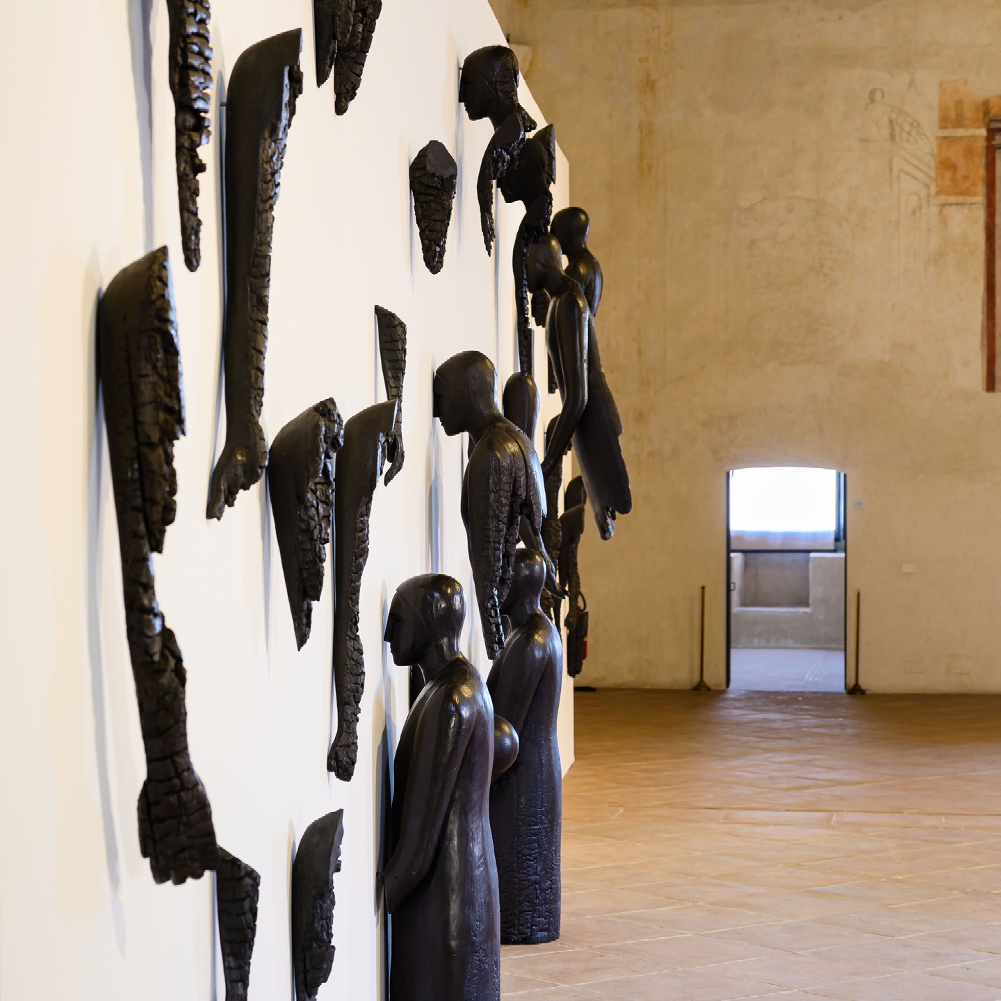 A Gubbio trovano spazio alcuni lavori particolarmente significativi degli ultimi due decenni. Una scelta piuttosto mirata è stata quella di inserire due opere che prevedono l’utilizzo della carta come supporto: 1799 (2009), i cui fogli con teste e volti sono piegati e incastrati all’interno di una scala, di reminiscenza poverista; 33 canti (2016), che prevede comunque l’incastro dei fogli, ma a comporre una danza di apparizioni umane, tra luce e ombra. Si rimanda così indirettamente anche all’impressionante corpus grafico dell’artista.